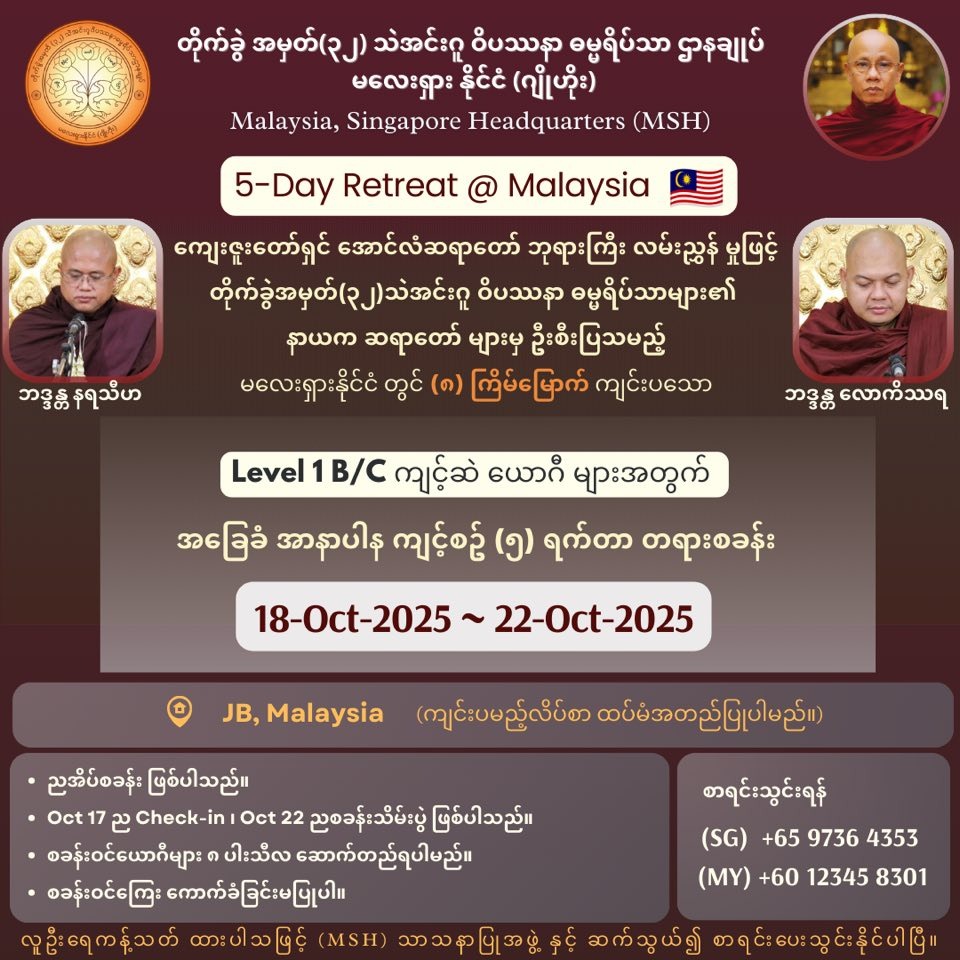 Malaysia (Johor Bahru)တွင် ၈ကြိမ်မြောက် ကျင်းပမည့် ယောဂီသစ် များအတွက် (၅)ရက်အဓိဌာန် အထူးတရားစခန်း
